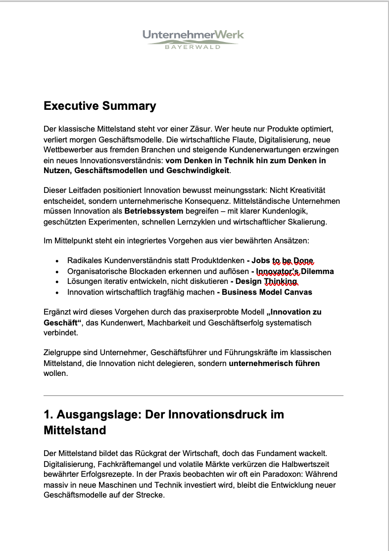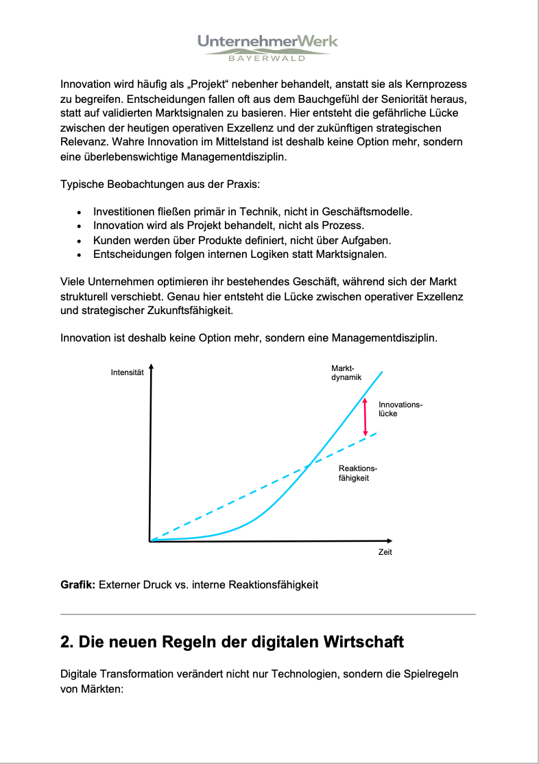 Echte Erneuerung ist kein Projekt für zwischendurch, sondern das Ergebnis methodischer Arbeit an Ihrem Unternehmen. Dieser Leitfaden zeigt Inhabern und Geschäftsführern im Mittelstand, wie sie neue Geschäftsmodelle entwickeln, die Krisen überstehen und Wachstum aktiv vorantreiben.