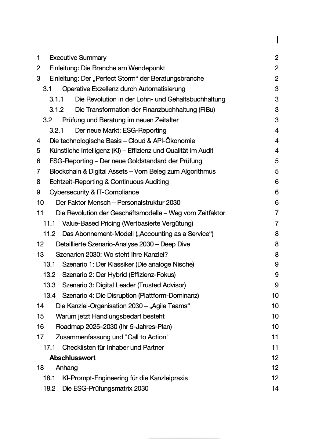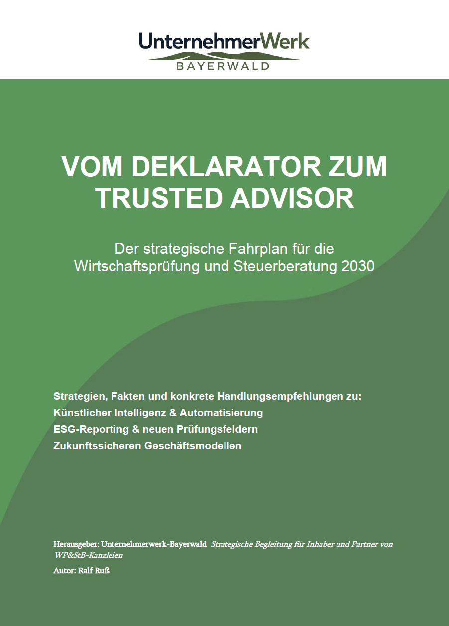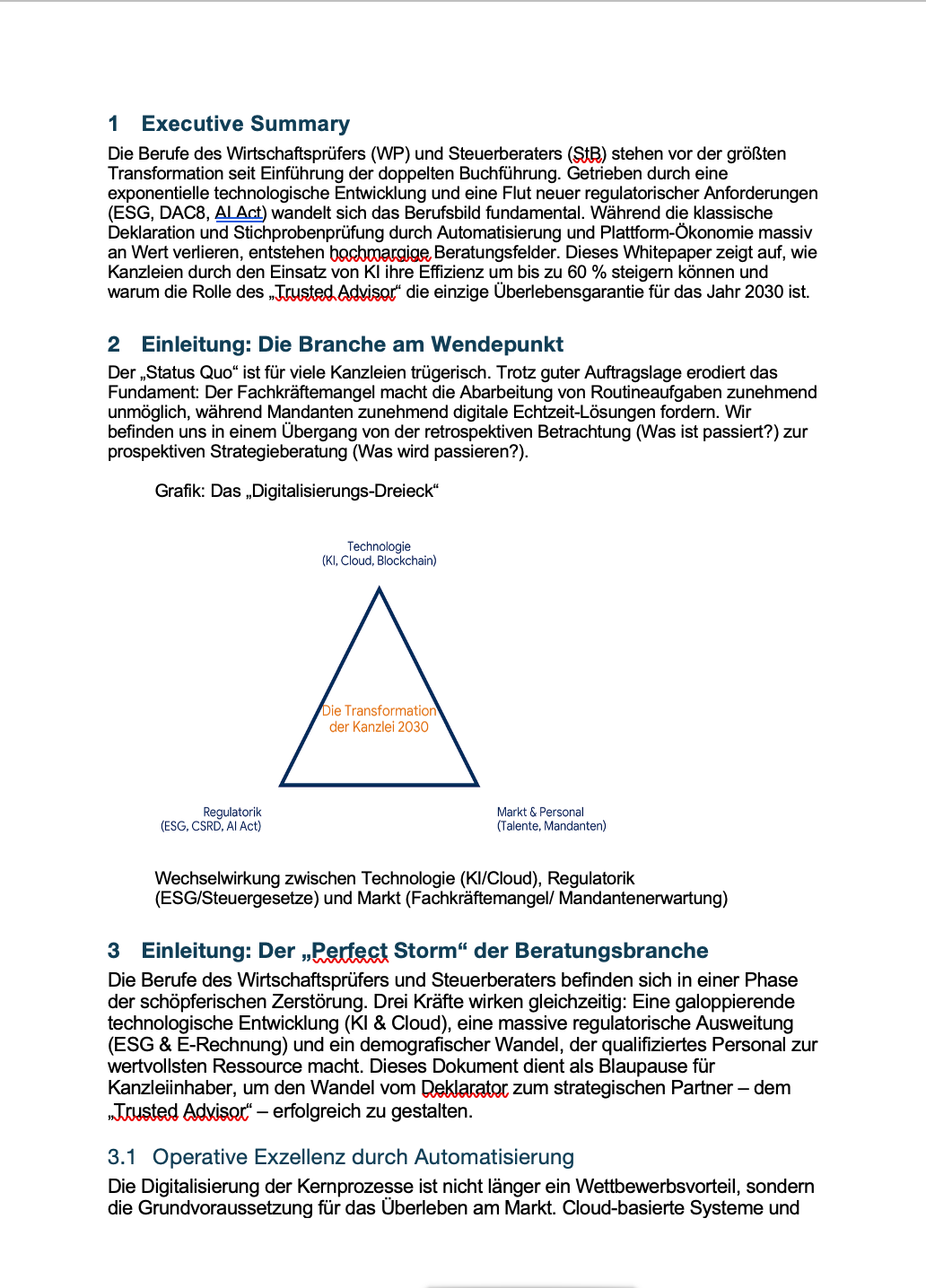 Basierend auf Marktdaten und praxisnahen Szenarien entwirft das Dokument einen konkreten 5-Jahres-Fahrplan für den Wandel vom Datenverwalter zum strategischen Trusted Advisor. Es ist ein Weckruf und zugleich eine präzise Anleitung für Inhaber und Partner, die den Wandel nicht nur überstehen, sondern ihn aktiv zur Marktführerschaft nutzen wollen.
